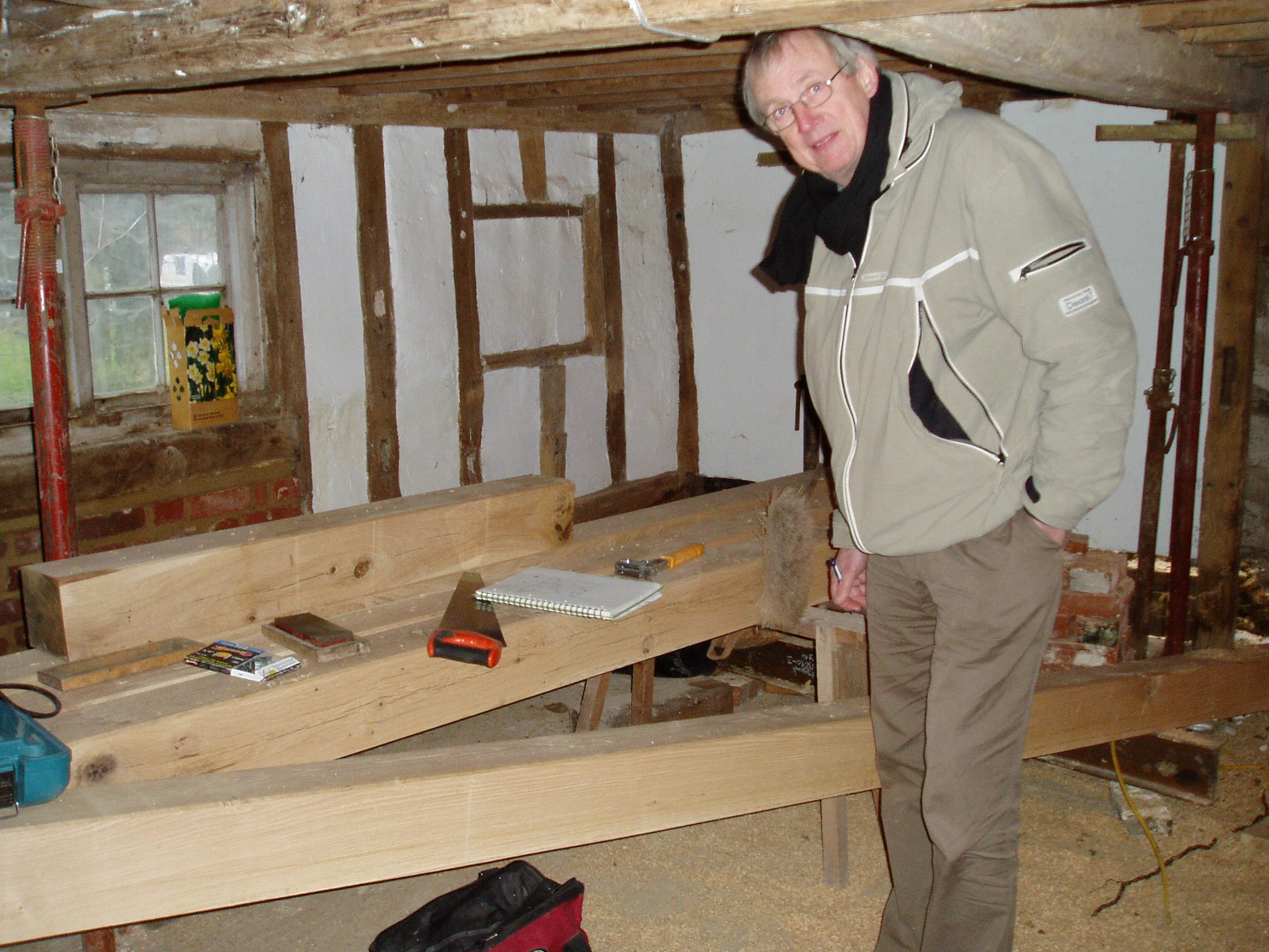 To do this, the specialist builders we contracted jacked up the walls of the house section by section, about 12 feet longitudinally at a time, using steel girders on steel props. The girders were put through holes – made as small as possible – in the walls just below first floor level, so that the beams that support the first floor could rest on them. The walls were hardly lifted; rather, the plan was to take the weight off the old sole plates and footings, build the new footings, re-using as many of the old bricks as possible, and raise the wall just enough to extract the the old timbers and insert new oak. Girders were also put through to support the old sole plates while the new, deeper, brick footings were being built.