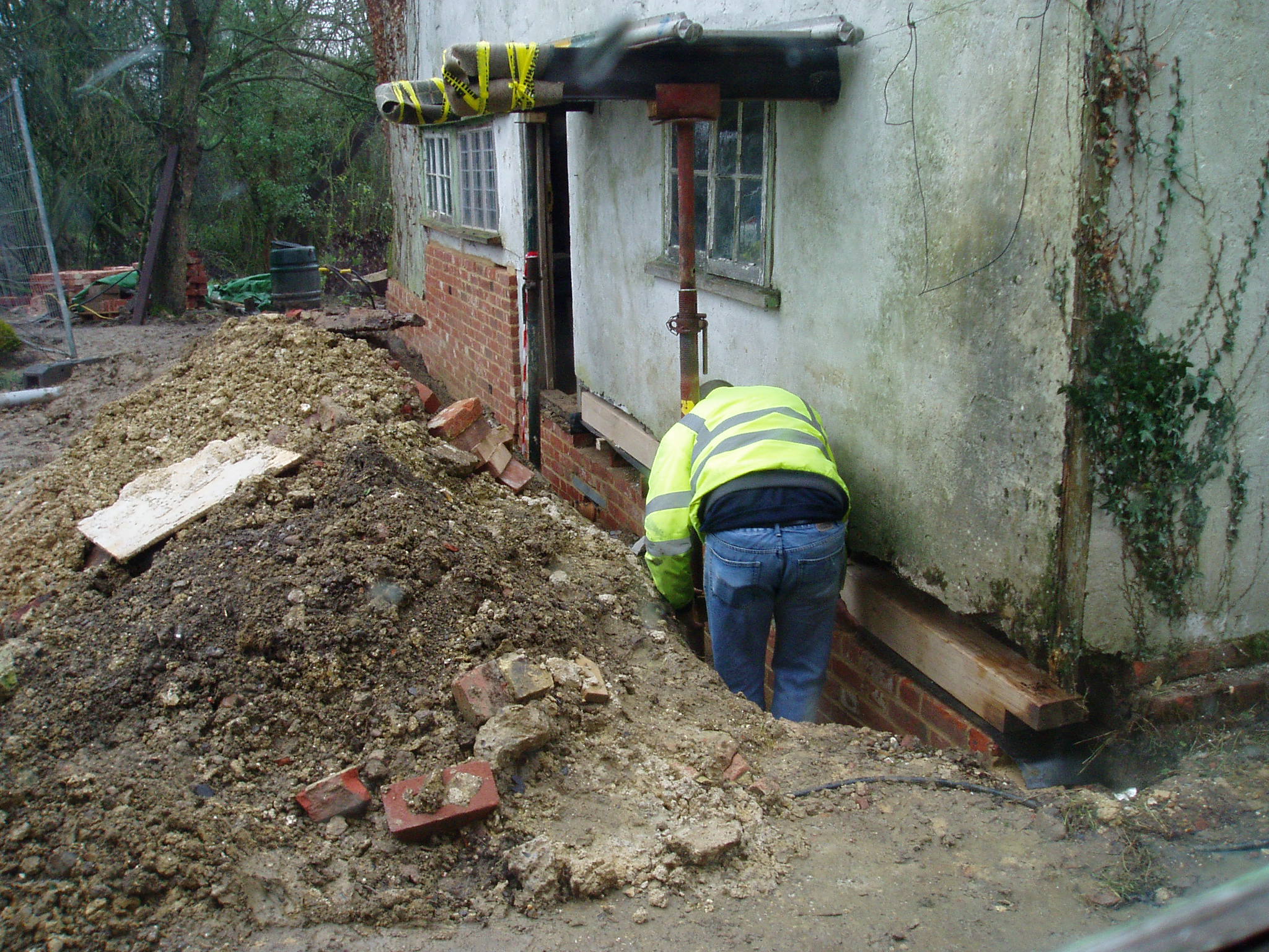 Building new brick footings upwards from a trench dug into the clay. A rotten oak sole plate, yet to be removed, can be seen above the bricks.