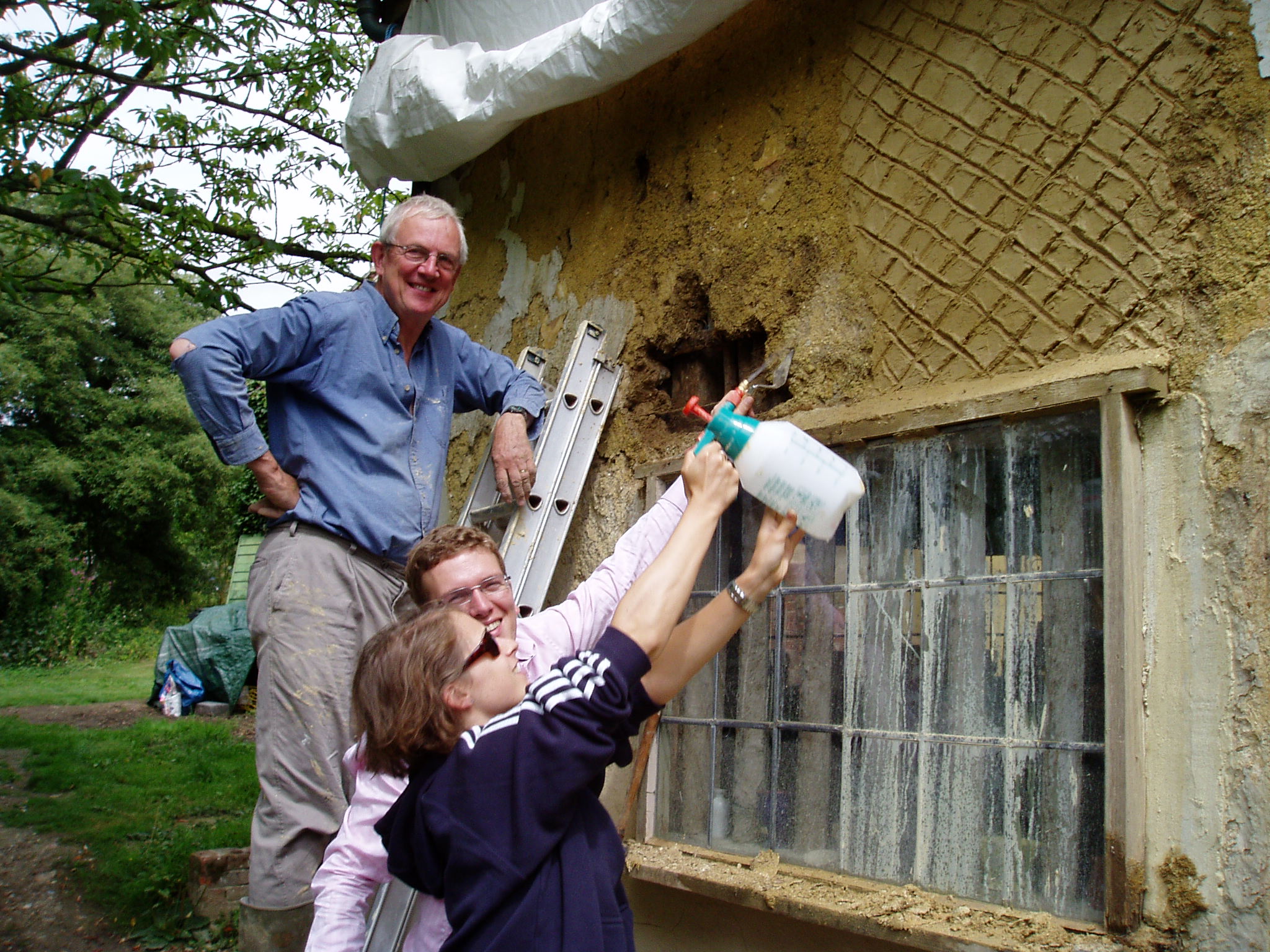 The clay and daub mix was left to dry for as long as possible – six weeks to three months, depending when it was done . The first week or so it was left covered with the plastic sheet and repeatedly sprayed to reduce the cracking.  (In future, we will use hessian instead of plastic, because it will keep the atmosphere damper). Though we started in early summer, the work went through July and August, which is not ideal, because the heat caused the materials to dry too fast.