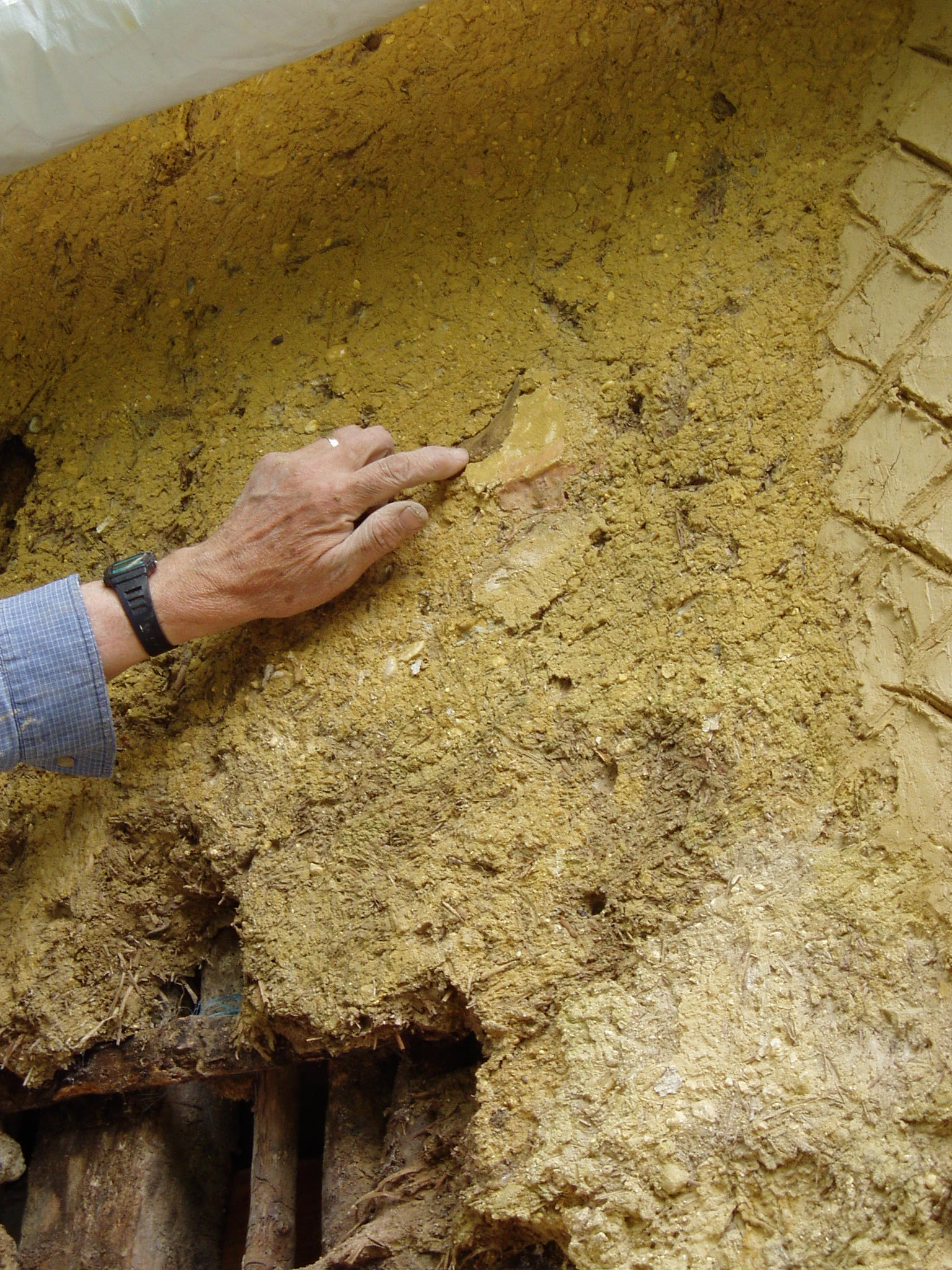 From June to September 2009, the exposed clay daub, which was most of it in this area, was repaired. New hazel supports were made where the holes were particularly large. The method taught at Onchors farm did not, strictly speaking, use wattles, which are woven lattices, but instead vertical sticks tied to horizontal ‘ledgers.’