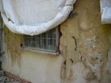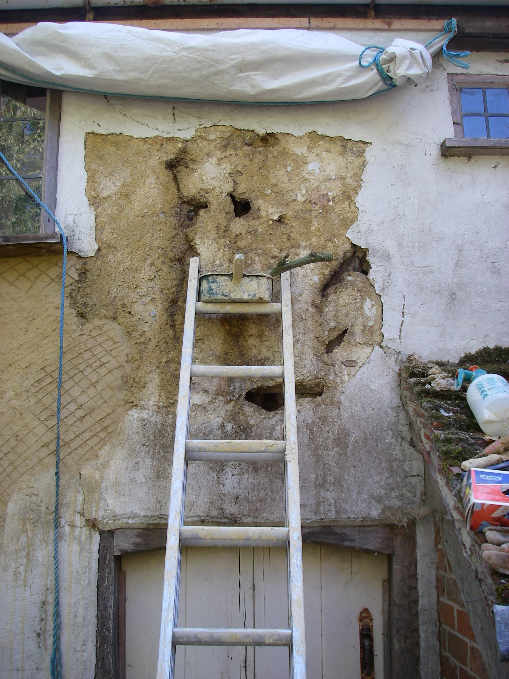 And so to work: the wall on the west side of the kitchen was very badly damaged. A lean-to had protected it but had disappeared. There were large holes in the clay dug by woodpeckers  seeking the insects that lived in the fabric. It was far from watertight, and beginning to dissolve. Early on, we had covered it in a  plastic sheet to slow the deterioration.