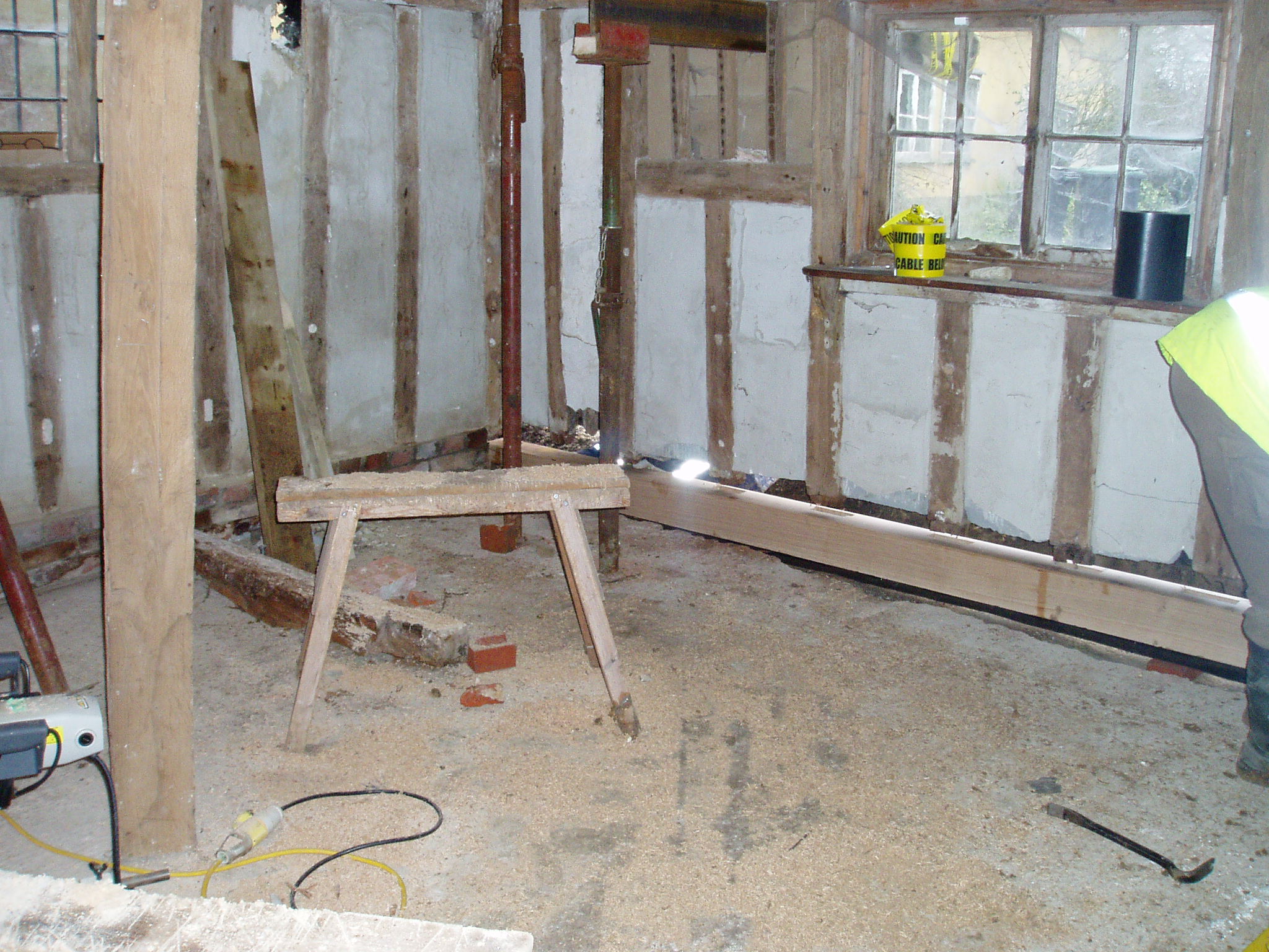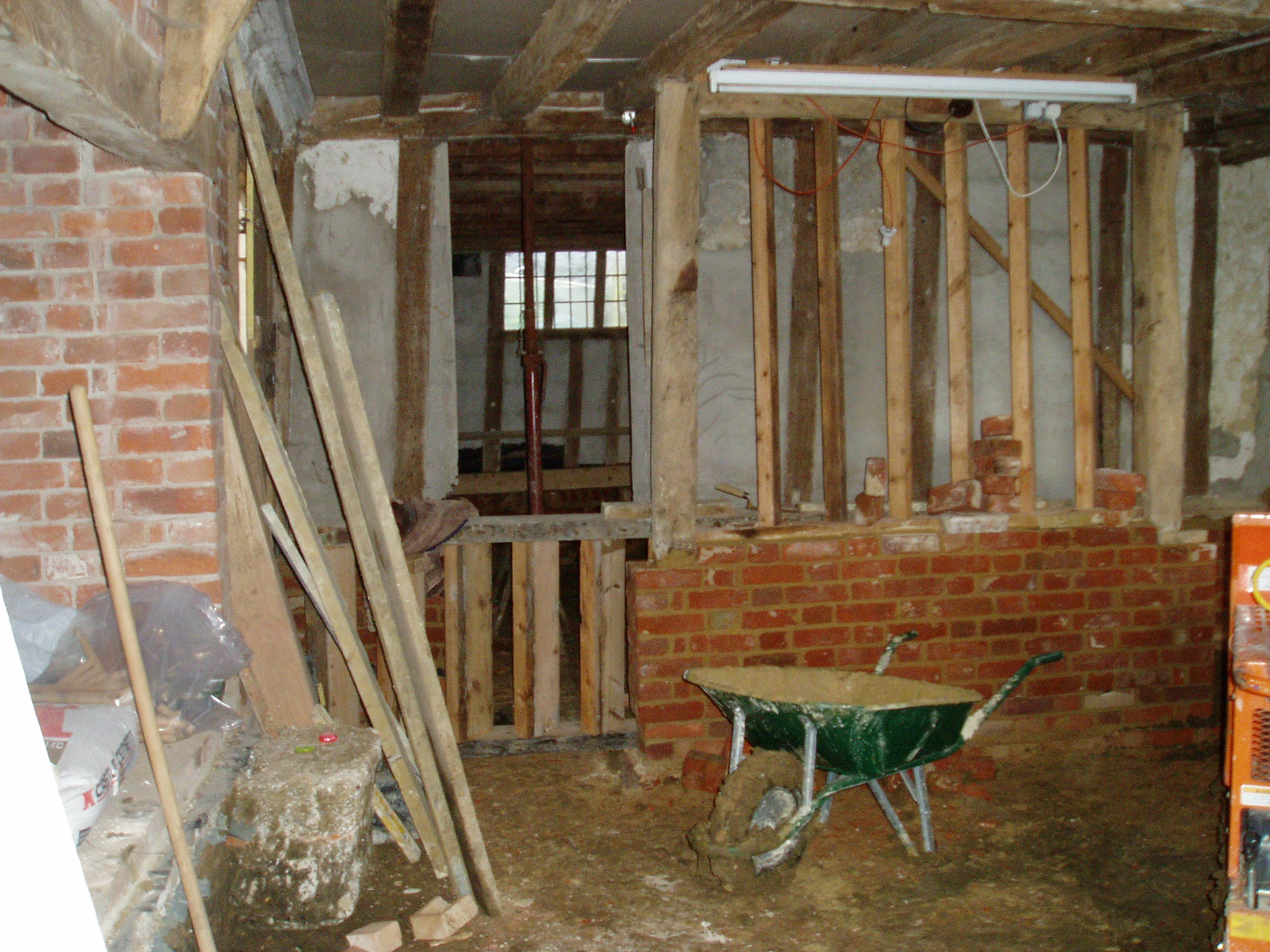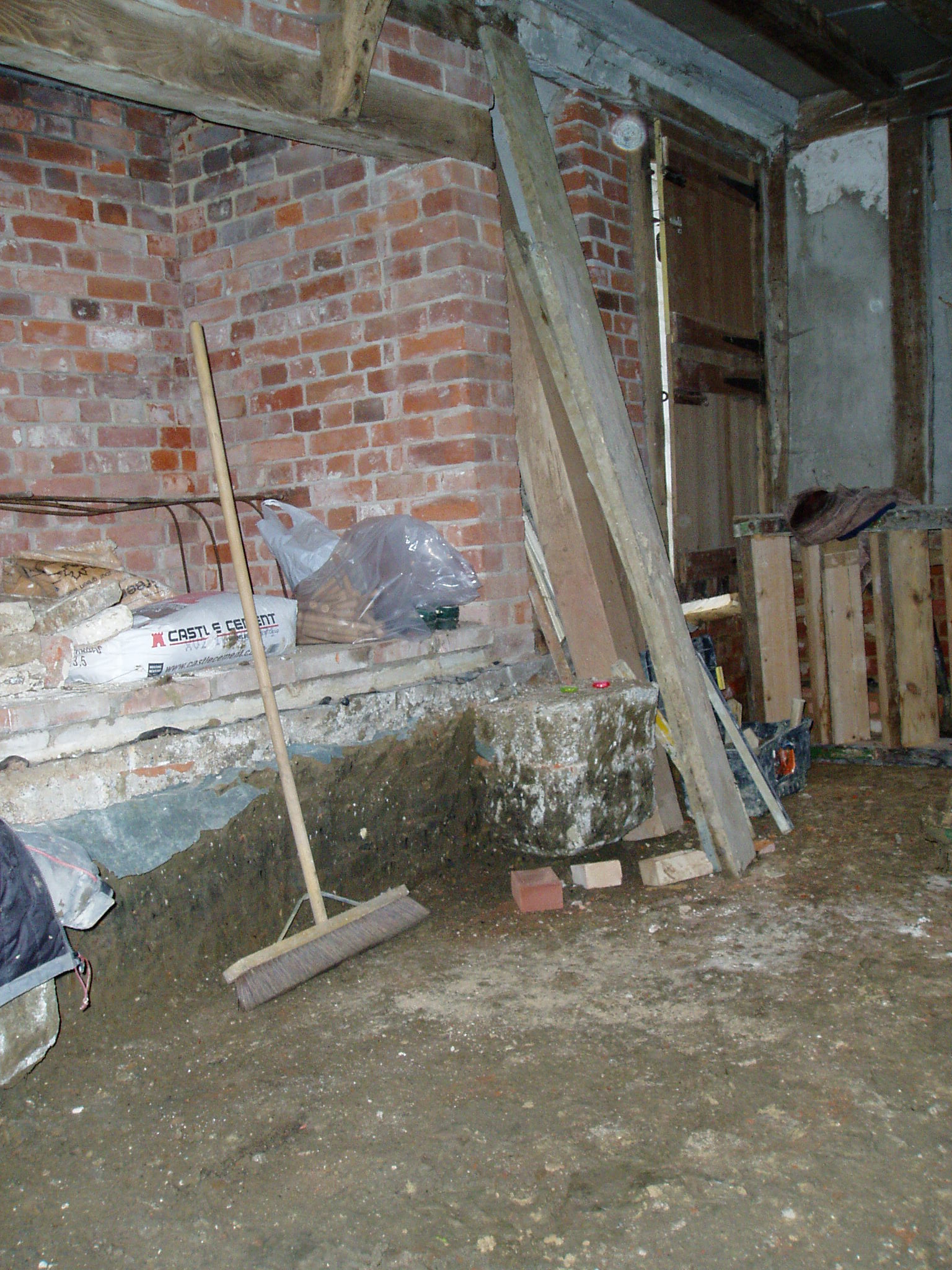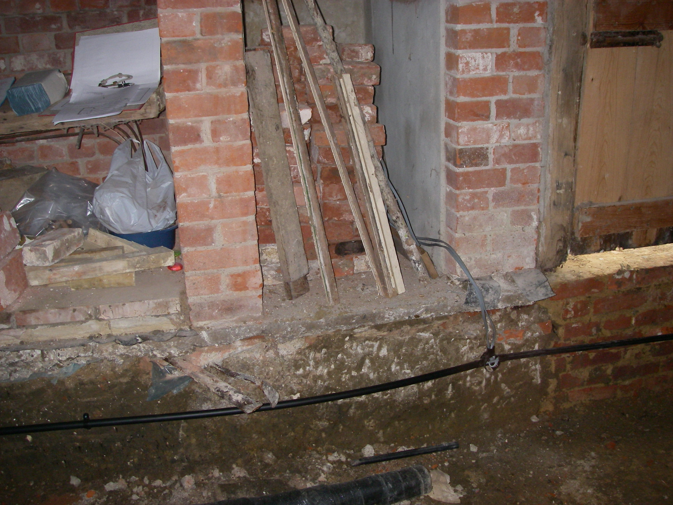 Before work started – plastic to keep the woodpeckers off. 2008.Preparing to insert the flitch beam.Inserting the new sole plate in the kitchen, early 2009.Connecting the power, early 2009Waste pipe from the first floor – early 2009.Installing the bath, spring 2009.The temporary window – to be a door later.Excavating for the power cable, early 2009.Sole plates and new footings done, getting ready to lime render the gap, using a permeable membrane.The fireplace after the floor was excavated, early 2009.New sole plates in the corner of the living room.Installing a ring main before the floor was laid.The chandelier installed in the main bedroom, 2009Loo and cabin for the builders 2009Materials for the limecrete floor, early 2009Protective covering on the back wall after the footings done – to keep the woodpeckers from the clay. Early 2009.The brewing hearth and the door to the demolished part of the building.Excavation nearly done