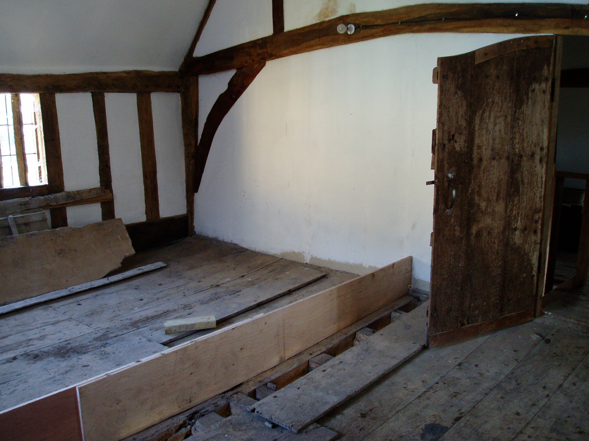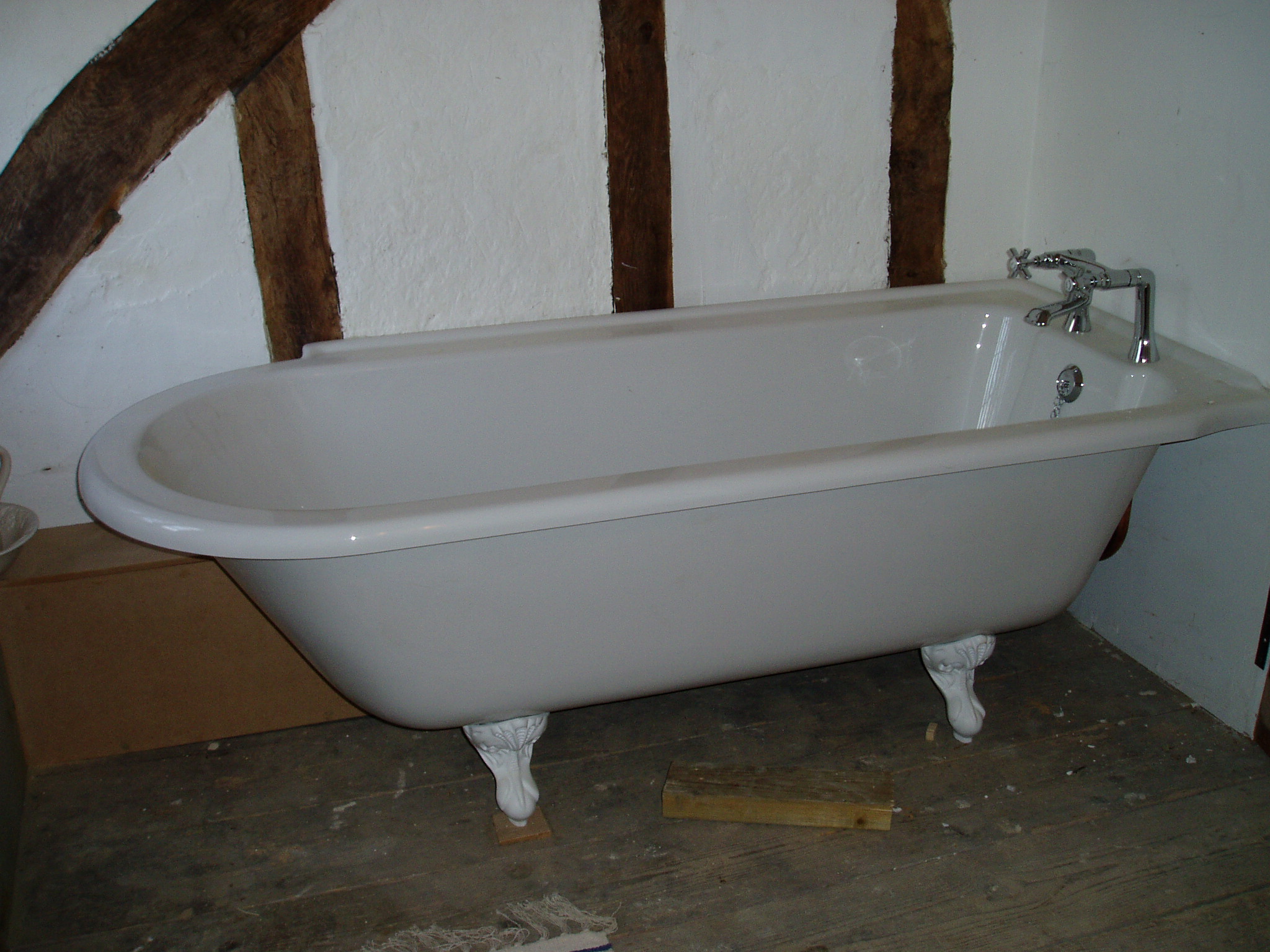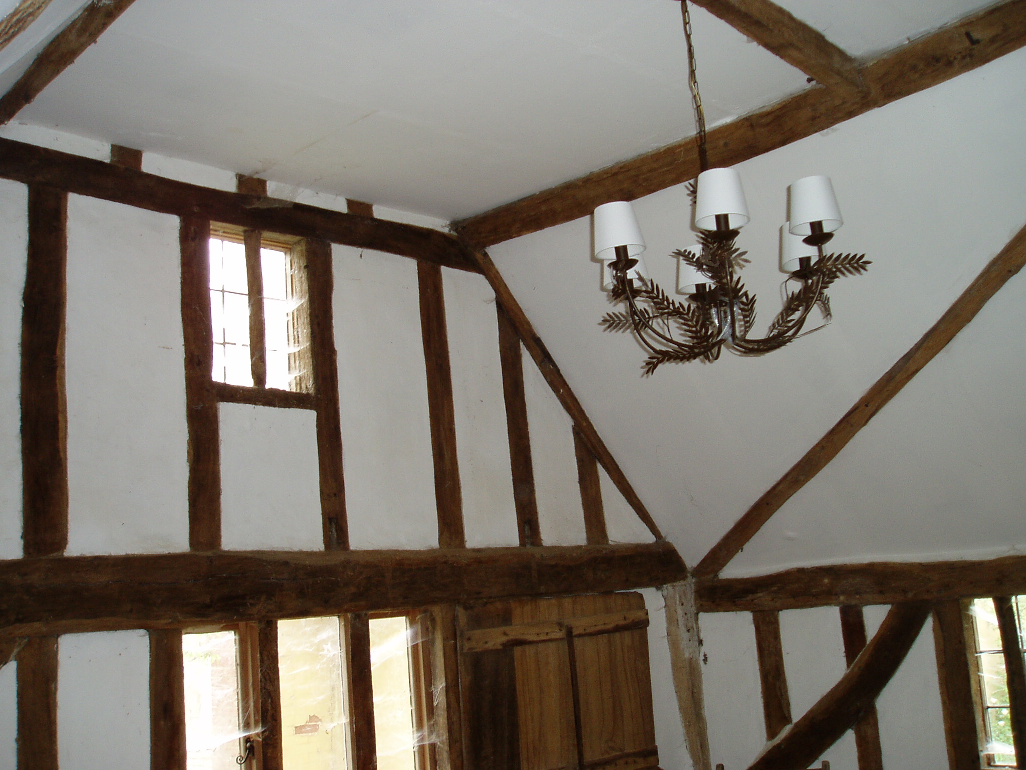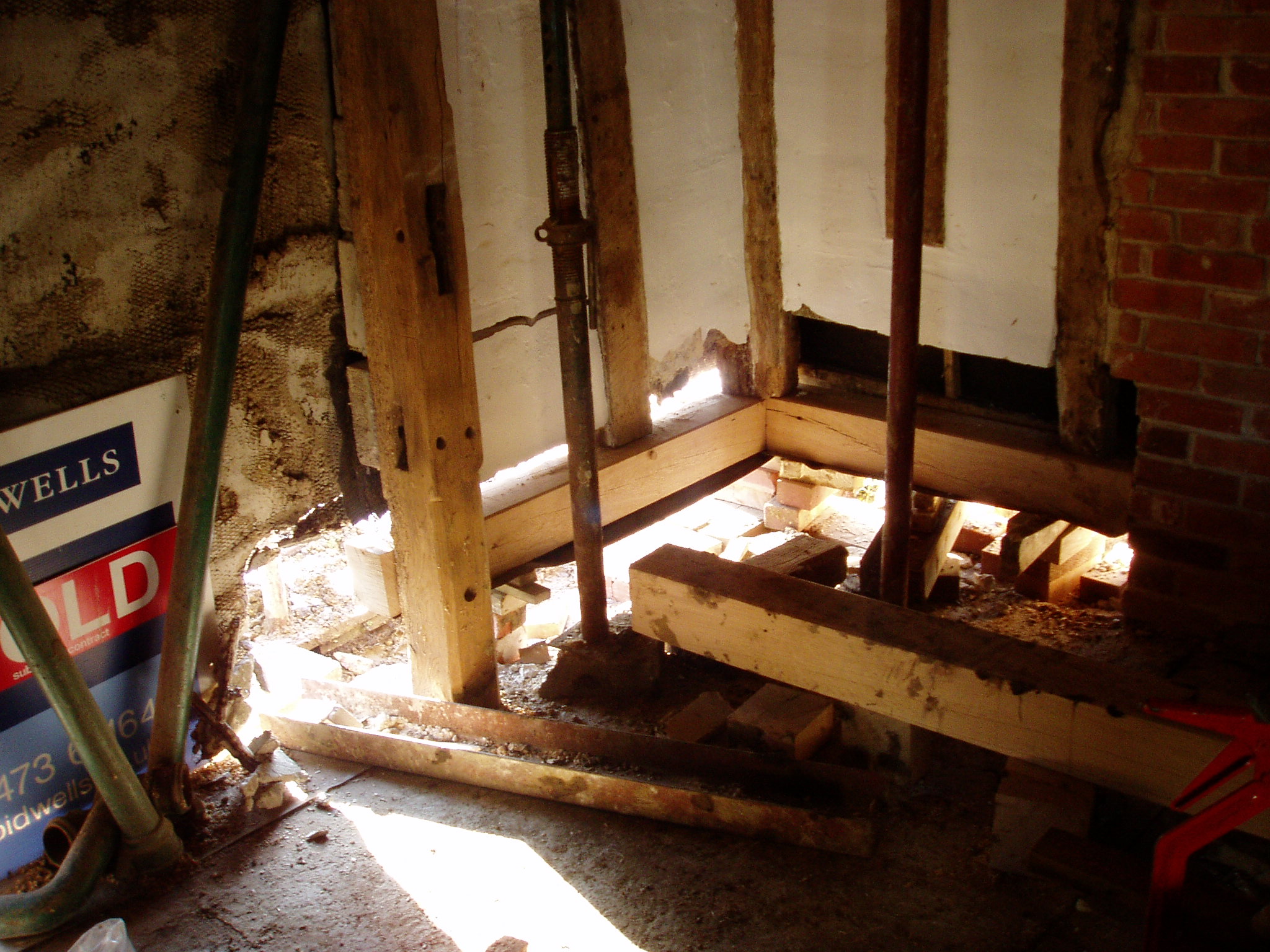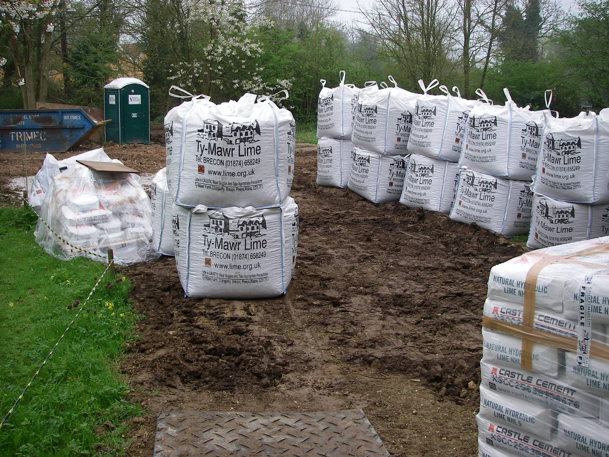 Before work started – plastic to keep the woodpeckers off. 2008.Preparing to insert the flitch beam.Inserting the new sole plate in the kitchen, early 2009.Connecting the power, early 2009Waste pipe from the first floor – early 2009.Installing the bath, spring 2009.The temporary window – to be a door later.Excavating for the power cable, early 2009.Sole plates and new footings done, getting ready to lime render the gap, using a permeable membrane.The fireplace after the floor was excavated, early 2009.New sole plates in the corner of the living room.Installing a ring main before the floor was laid.The chandelier installed in the main bedroom, 2009Loo and cabin for the builders 2009Materials for the limecrete floor, early 2009Protective covering on the back wall after the footings done – to keep the woodpeckers from the clay. Early 2009.The brewing hearth and the door to the demolished part of the building.Excavation nearly done