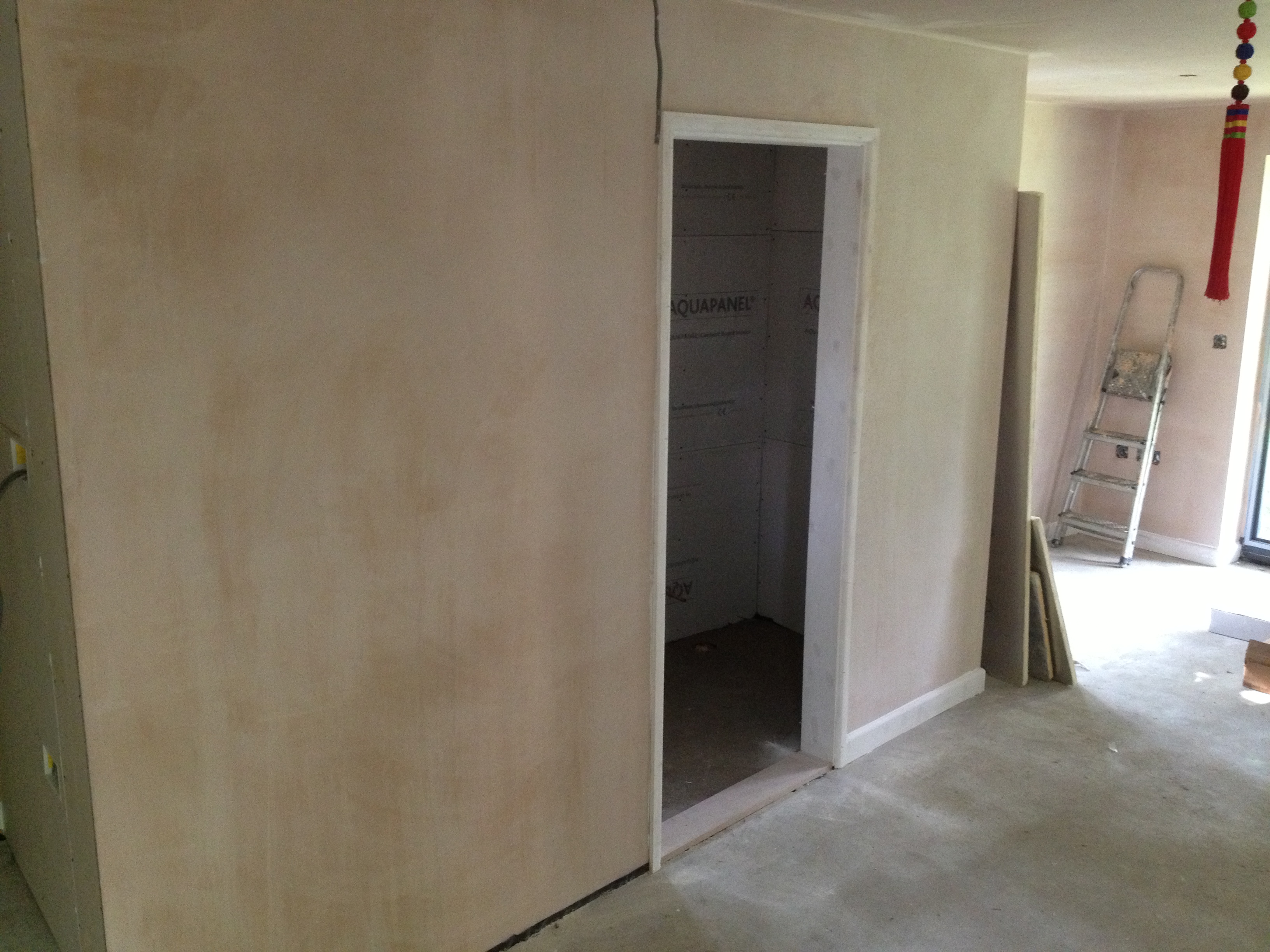 By this stage, the electrician and plumber had been called in to do the first fix, of wiring and piping. This of course has to be done before plasterboarding the internal walls and ceilings and screeding the ground floor. (The screed was laid on top of a layer of Celotex insulation).