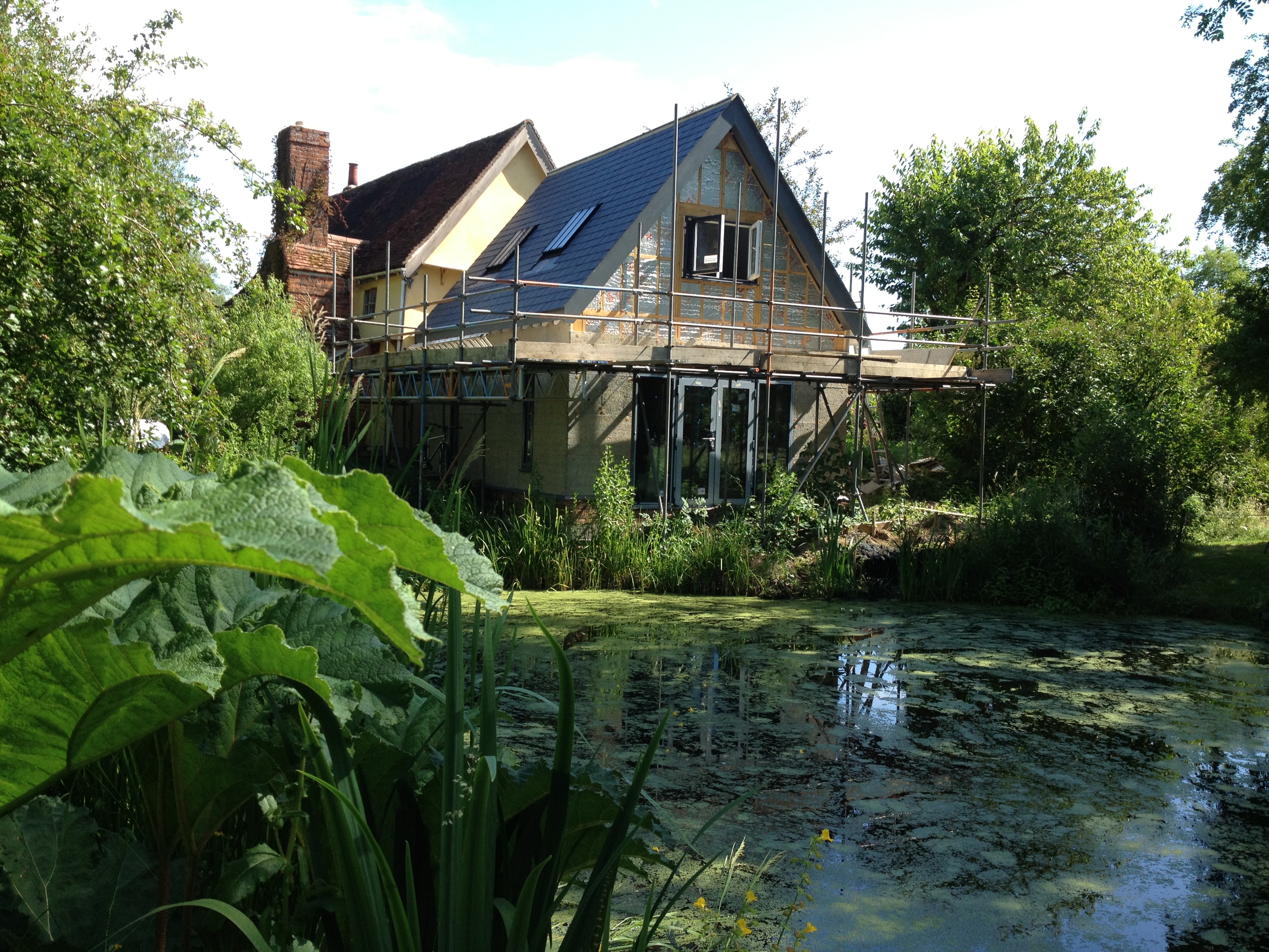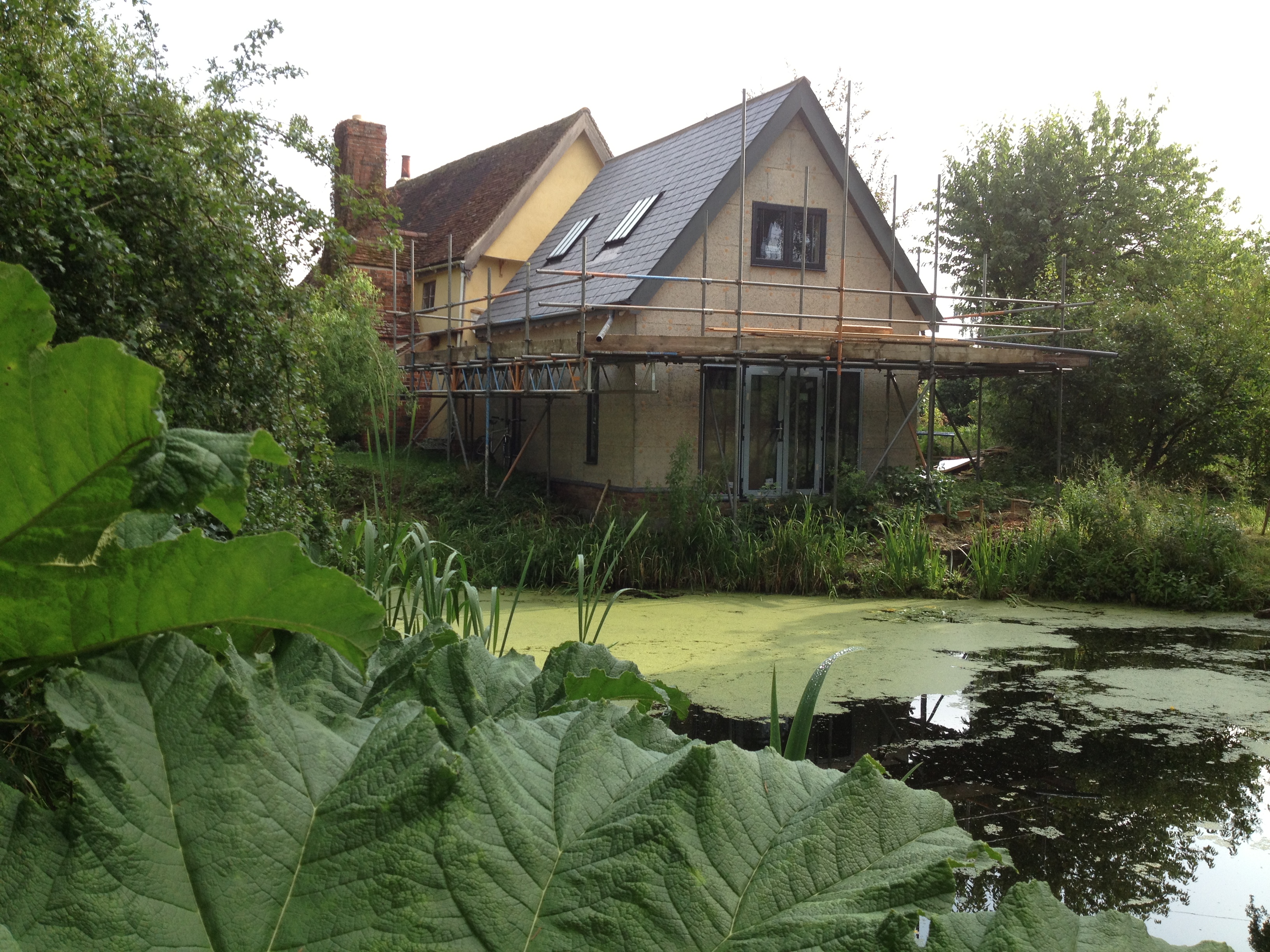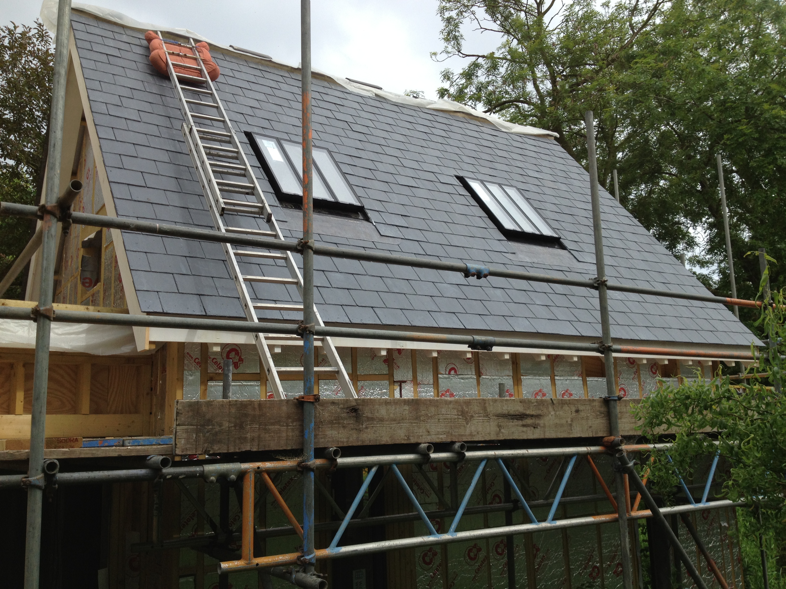 After the frame was finished and most of the insulation installed, there was a delay getting our Canadian slates on site, because the UK supplier had run out of stock. (For an explanation of why they had to come so far, see Continental Drift and the Art of Choosing Slates). Once the slates arrived, the shell of the building was quickly made weathertight, which included fitting the conservation rooflights from The Rooflight Company. These are solidly built, nearly flush and much favoured by conservation officers.
