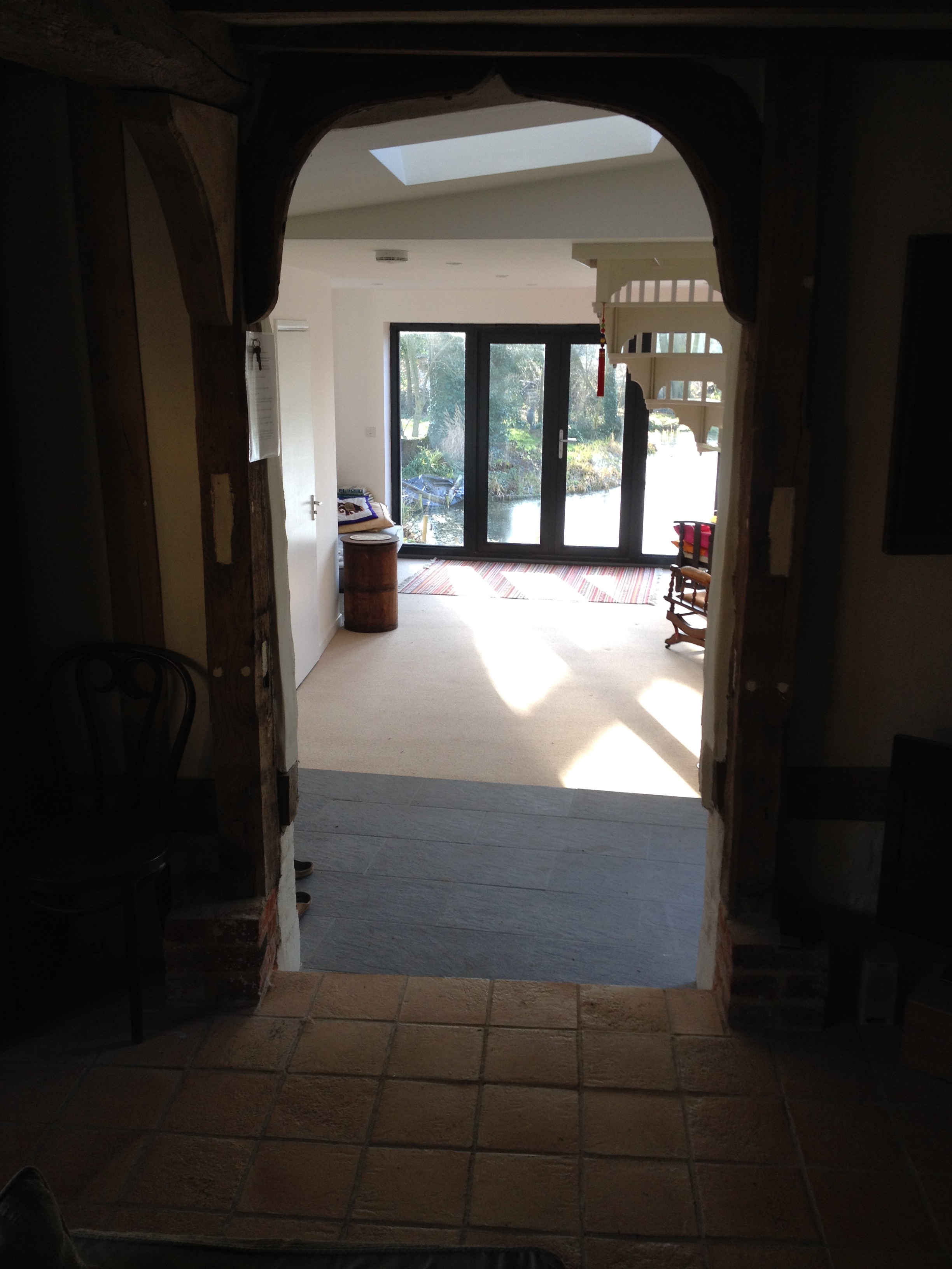 We started Phase Two, the extension, in January 2014. It is timber framed, in keeping with the spirit of the old building, even if technically very different. It combines a shape borrowed from the old building with modern detail such as aluminium doors and windows to prevent it looking like a pastiche.