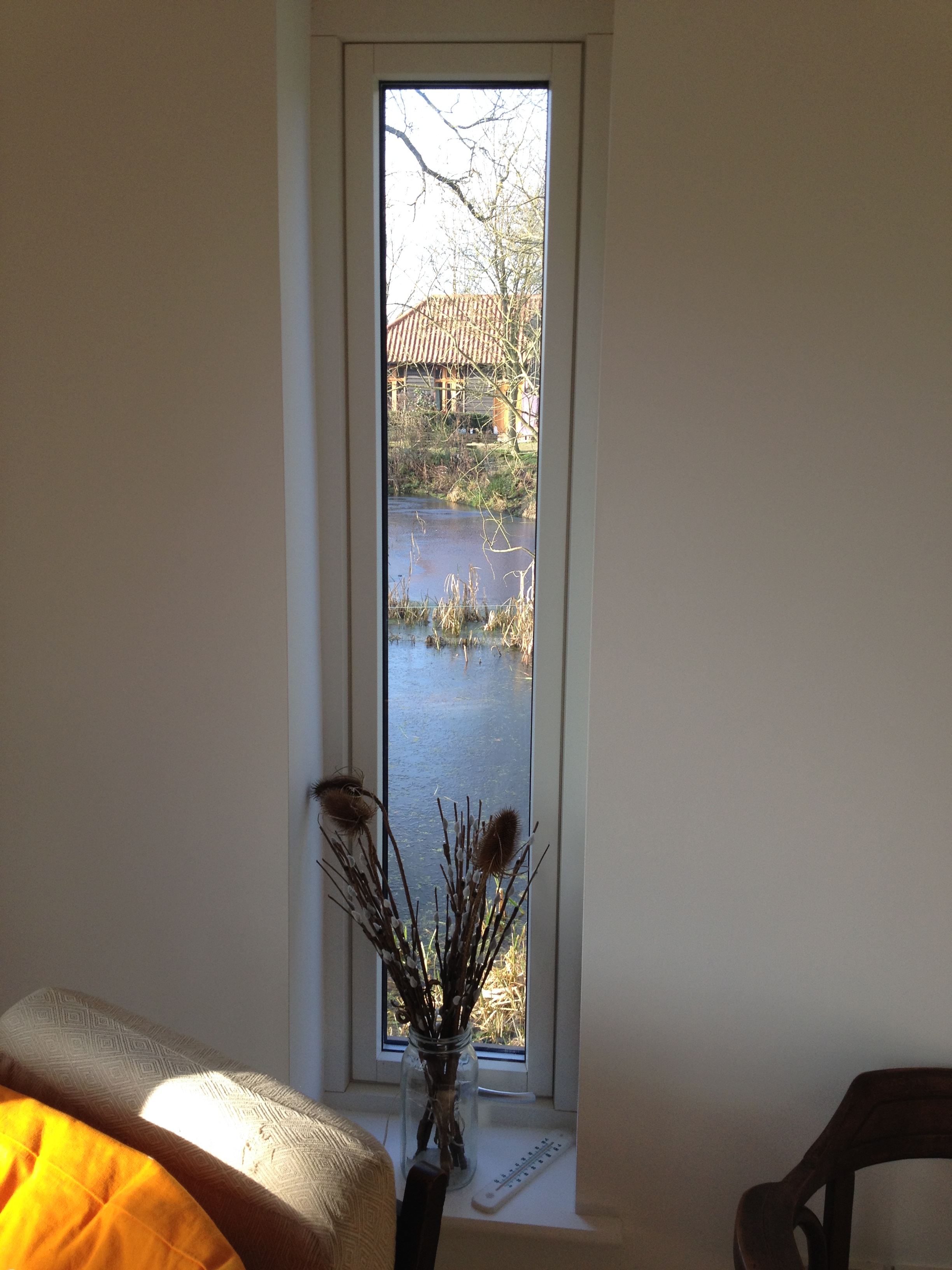 This all meant some interesting weeks visiting suppliers in East Anglia, London and as far afield as the Peak District (for the stairs), comparing specifications and costs and double and treble checking every measurement. It was a relief to find that our paperwork combined with Terry’s accurate sizing of window, door and stair apertures led to an exact fit for everything we had ordered. Terry had earlier shown his measurement skills by accurately pegging out the foundations, which was particularly tricky because the extension is at a lower level than the old building, and at a slight angle to it, so that it looks straight down the middle of the pond.