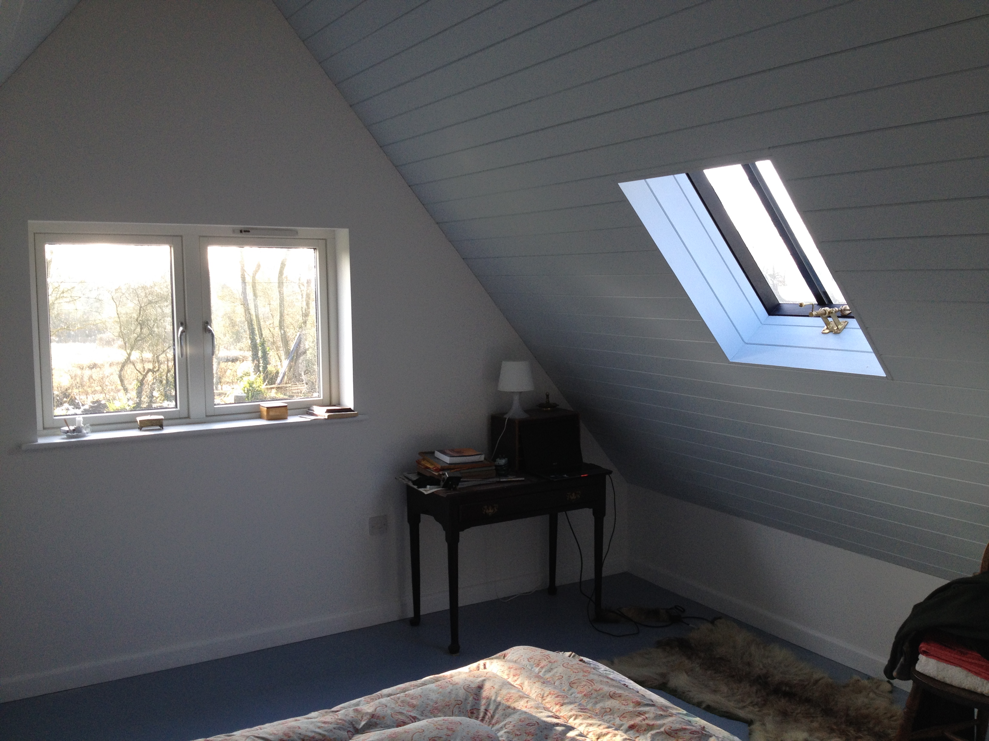 We were lucky to find that Terry Booty of Booty Builders of Laxfield, along with Andrew and Tim, his two excellent craftsmen, were able to fit our extension into their schedule in the spring, and they completed it in the early autumn. They were multi-talented, with all the building skills between the three of them. (They only subcontracted plumbing and electrics, lime plastering the outside walls and the specialist metal roof on the single story structure that joins old to new). Terry was happy for us to take on some of the sourcing and ordering, notably the aluminium windows and doors (Kloeber) , the spiral staircase (British Spirals and Castings, formerly Cottage Craft Spirals) and the slates (Glendyne from Cembrit) , and we also researched and specified the oak front door (Jonathan Read, Malcom Neeve Joinery), the tiles and – with advice from lime specialists – the external plaster and paint, which was limewash from Ingilby’s of Glemsford.
