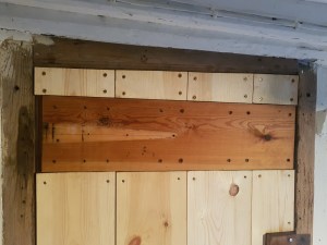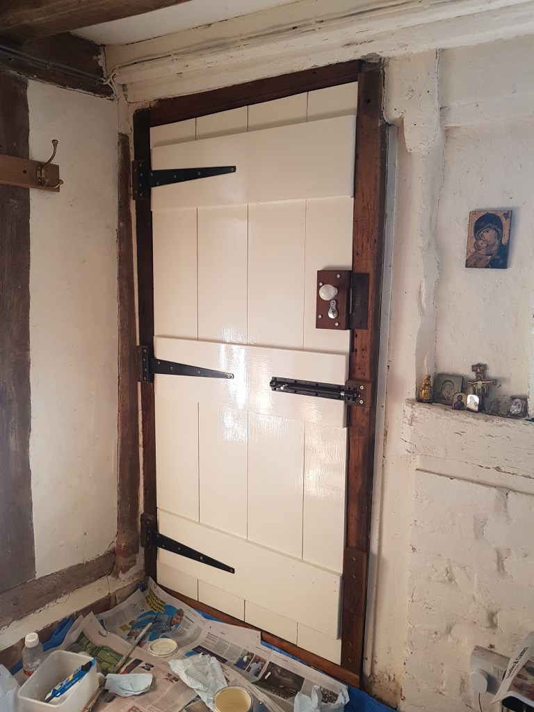 The inside of the old door had three coats of a combined anti-fungus liquid and woodworm controller applied, followed by two coats of boiled linseed oil. The new wood was similarly treated on both sides before being fixed.